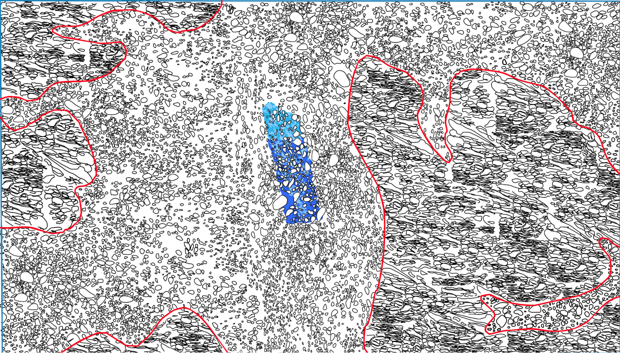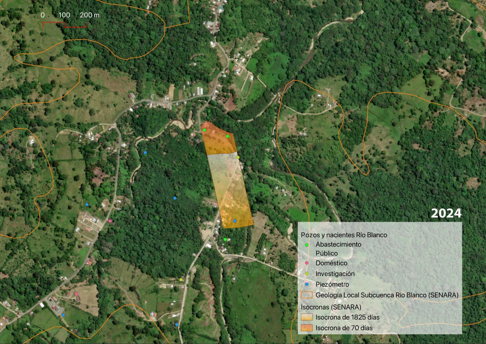 Our project produced a series of drawings, both digital and by hand, which were made through a careful study of the different rock formations in Río Blanco. They are overlaid into the borders drawn by the Hydrogeological Study of Río Blanco, which include local and regional geological formations. We then took these textures and applied them to the map of two iscrones - which are a measurement of time and distance - drawn around the two wells administered by the ASADA in Río Blanco. These isocrones estimate how long a contaminant would take to reach the well from two different locations. These experiments are an invitation to the viewer to think with materiality of the underground as it relates to movement and form, and what that means for water and other liquids as they travel through the ground beneath our feet.